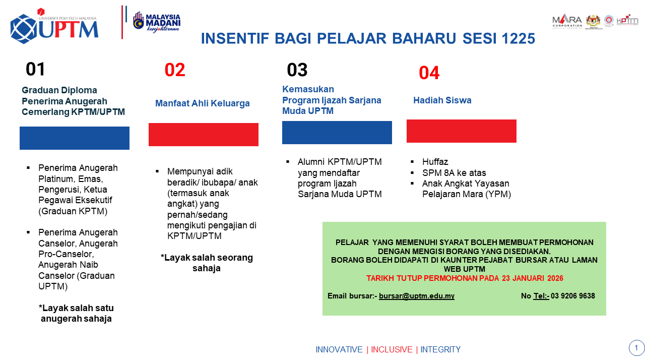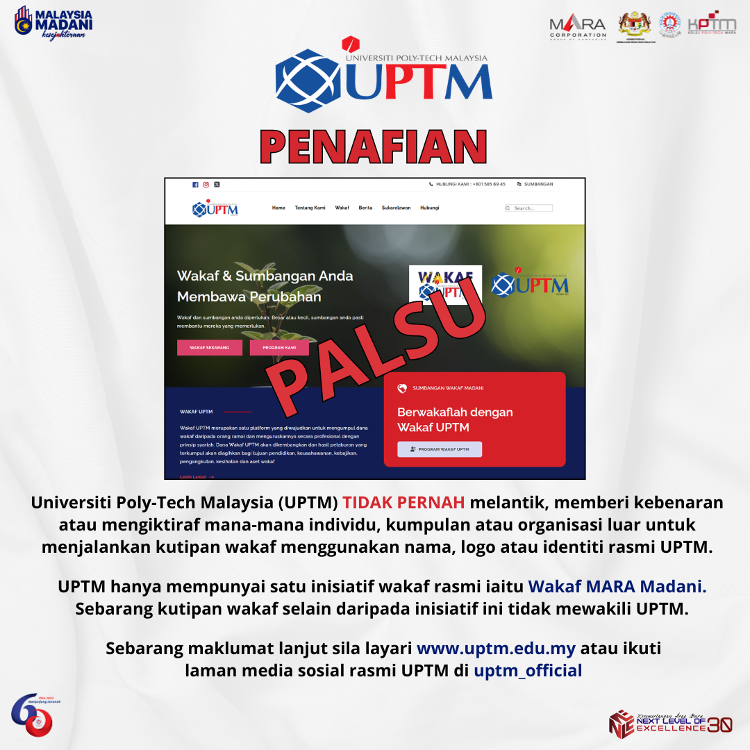 Universiti Poly-Tech Malaysia (UPTM) is a leading institution of higher learning with a vision to become the university of choice for nurturing professionals who will make a positive impact on the nation. It is dedicated to nurturing the next generation of professionals by offering personalised education that emphasises the development of human attributes and the integration of contemporary technologies into every field of its education. It also upholds the concept that every student should be empowered to be their best selves, as future contributors to a better tomorrow for our nation and beyond. UPTM's commitment to its motto of Innovative, Inclusive, Integrity is reflected in its efforts to develop highly skilled and knowledgeable professionals who possess the essential qualities of professionalism, ethical responsibility, and social awareness. Indeed, UPTM is a university that prepares graduates who are not only highly skilled and knowledgeable, but also possess the essential qualities of professionalism, ethical responsibility, and social awareness.