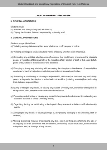 8PART II: GENERAL DISCIPLINE3. GENERAL CONDITIONSStudents must:(a) Possess and always carry their Student ID;(b) Display the Student ID when requested by university staff.4. GENERAL PROHIBITIONSStudents are prohibited from:(a) Violating any regulations or written laws, whether on or off campus, or online.(b) Violating any religious laws and cultural norms of society, whether on or off campus.(c) Conducting any activities, whether on or off campus, that could harm or damage the interests, peace, or reputation of the university, or the reputation of any student or staff, or that could disturb public order, safety, or moral decency and discipline.(d) Disrupting or in any way interfering with, or causing the disruption or interference of, any activities conducted under the instruction or with the permission of university authorities.(e) Preventing or obstructing, or causing to be prevented, obstructed, or disturbed, any staff or any person acting under the direction or authorisation of an officer (including students) from performing their duties or responsibilities;(f) Injuring or killing by any means, or causing any student, university staff, or member of the public to be injured or killed, whether within or outside the university;(g) Preventing or obstructing, or causing any student to be prevented or obstructed from attending any academic activities or official university events;(h) Organising, inciting, or participating in the boycott of any academic activities or official university events;(i) Damaging by any means, or causing damage to, any property belonging to the university, staff, or students;(j) Altering, disrupting, moving, or damaging any item, object, or thing, or performing any act, or causing any act to be performed, with the intent to, or that may, cause obstruction, inconvenience, annoyance, loss, or damage to any person;Student Handbook and Disciplinary Regulations of Universiti Poly-Tech Malaysia