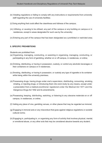 9(k) Violating regulations or failing to comply with any instructions or requirements from university staff regarding the use of university facilities;(l) Doing anything that could affect the cleanliness and tidiness of the campus;(m) Utilising, or causing to be utilised, any part of the campus or any building on campus or in residences, except in areas designated for such use by the university;(n) Entering any part of the campus that has been designated as a prohibited or restricted area;5. SPECIFIC PROHIBITIONSStudents are prohibited from:(a) Organising, managing, conducting, or assisting in organising, managing, conducting, or participating in any form of gambling, whether on or off campus, in residences, or online;(b) Drinking, distributing, or having in possession, custody, or control any alcoholic beverages or their containers on campus or in residences;(c) Smoking, distributing, or having in possession, or custody any type of cigarette or its container while being within the university premises;(d) Possessing drugs, having drugs under one's supervision, distributing, consuming, smoking, inhaling, or injecting drugs, or introducing them into one's body by any means, except under a prescription from a medical practitioner registered under the Medical Act 1971 and the Dangerous Drugs Act 1952 and its amendments;(e) Possessing, keeping, distributing, watching, or listening to any obscene materials on or off campus, in residences, or online;(f) Visiting any place of vice, gambling venues, or other places that may be regarded as immoral;(g) Engaging in immoral acts or any misconduct that goes against religious regulations or societal cultural norms;(h) Engaging in, participating in, or organising any form of activity that involves physical, mental, or emotional abuse, or any other acts that may be considered abusive towards any student;Student Handbook and Disciplinary Regulations of Universiti Poly-Tech Malaysia
