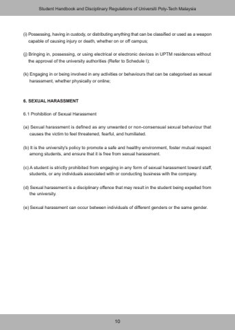 10(i) Possessing, having in custody, or distributing anything that can be classified or used as a weapon capable of causing injury or death, whether on or off campus;(j) Bringing in, possessing, or using electrical or electronic devices in UPTM residences without the approval of the university authorities (Refer to Schedule I);(k) Engaging in or being involved in any activities or behaviours that can be categorised as sexual harassment, whether physically or online;6. SEXUAL HARASSMENT6.1 Prohibition of Sexual Harassment(a) Sexual harassment is defined as any unwanted or non-consensual sexual behaviour that causes the victim to feel threatened, fearful, and humiliated.(b) It is the university's policy to promote a safe and healthy environment, foster mutual respect among students, and ensure that it is free from sexual harassment.(c) A student is strictly prohibited from engaging in any form of sexual harassment toward staff, students, or any individuals associated with or conducting business with the company.(d) Sexual harassment is a disciplinary offence that may result in the student being expelled from the university.(e) Sexual harassment can occur between individuals of different genders or the same gender.Student Handbook and Disciplinary Regulations of Universiti Poly-Tech Malaysia