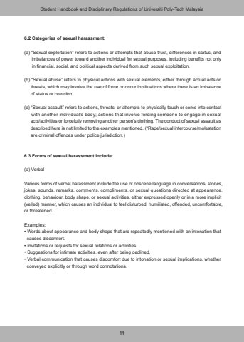 116.2 Categories of sexual harassment:(a) %u201cSexual exploitation%u201d refers to actions or attempts that abuse trust, differences in status, and imbalances of power toward another individual for sexual purposes, including benefits not only in financial, social, and political aspects derived from such sexual exploitation.(b) %u201cSexual abuse%u201d refers to physical actions with sexual elements, either through actual acts or threats, which may involve the use of force or occur in situations where there is an imbalance of status or coercion.(c) %u201cSexual assault%u201d refers to actions, threats, or attempts to physically touch or come into contact with another individual's body; actions that involve forcing someone to engage in sexual acts/activities or forcefully removing another person's clothing. The conduct of sexual assault as described here is not limited to the examples mentioned. (*Rape/sexual intercourse/molestation are criminal offences under police jurisdiction.)6.3 Forms of sexual harassment include:(a) VerbalVarious forms of verbal harassment include the use of obscene language in conversations, stories, jokes, sounds, remarks, comments, compliments, or sexual questions directed at appearance, clothing, behaviour, body shape, or sexual activities, either expressed openly or in a more implicit (veiled) manner, which causes an individual to feel disturbed, humiliated, offended, uncomfortable, or threatened.Examples:%u2022 Words about appearance and body shape that are repeatedly mentioned with an intonation that causes discomfort.%u2022 Invitations or requests for sexual relations or activities.%u2022 Suggestions for intimate activities, even after being declined.%u2022 Verbal communication that causes discomfort due to intonation or sexual implications, whether conveyed explicitly or through word connotations.Student Handbook and Disciplinary Regulations of Universiti Poly-Tech Malaysia