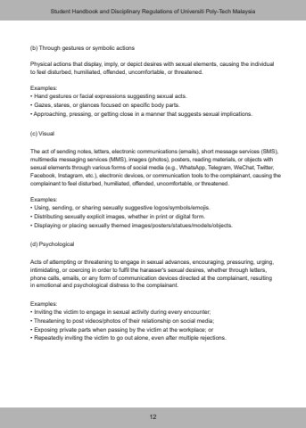 12(b) Through gestures or symbolic actionsPhysical actions that display, imply, or depict desires with sexual elements, causing the individual to feel disturbed, humiliated, offended, uncomfortable, or threatened.Examples:%u2022 Hand gestures or facial expressions suggesting sexual acts.%u2022 Gazes, stares, or glances focused on specific body parts.%u2022 Approaching, pressing, or getting close in a manner that suggests sexual implications.(c) VisualThe act of sending notes, letters, electronic communications (emails), short message services (SMS), multimedia messaging services (MMS), images (photos), posters, reading materials, or objects withsexual elements through various forms of social media (e.g., WhatsApp, Telegram, WeChat, Twitter, Facebook, Instagram, etc.), electronic devices, or communication tools to the complainant, causing the complainant to feel disturbed, humiliated, offended, uncomfortable, or threatened.Examples:%u2022 Using, sending, or sharing sexually suggestive logos/symbols/emojis.%u2022 Distributing sexually explicit images, whether in print or digital form.%u2022 Displaying or placing sexually themed images/posters/statues/models/objects.(d) PsychologicalActs of attempting or threatening to engage in sexual advances, encouraging, pressuring, urging, intimidating, or coercing in order to fulfil the harasser's sexual desires, whether through letters, phone calls, emails, or any form of communication devices directed at the complainant, resultingin emotional and psychological distress to the complainant.Examples:%u2022 Inviting the victim to engage in sexual activity during every encounter;%u2022 Threatening to post videos/photos of their relationship on social media;%u2022 Exposing private parts when passing by the victim at the workplace; or%u2022 Repeatedly inviting the victim to go out alone, even after multiple rejections.Student Handbook and Disciplinary Regulations of Universiti Poly-Tech Malaysia