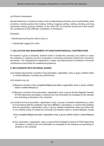 13(e) Physical HarassmentSexual behaviours or physical contact, such as approaching someone at an uncomfortably closeproximity, including actions like holding, tickling, hugging, patting, rubbing, stroking, pinching, squeezing, kissing, groping, fondling, or any other form of unwanted sexual touch that causes the complainant to feel offended, humiliated, or threatened.Examples:%u2022 Intentionally touching the victim's body; or %u2022 Intentionally hugging the victim.7. COLLECTION AND MANAGEMENT OF DONATIONS/FINANCIAL CONTRIBUTIONSNo student or group of students, whether inside or outside the university, may collect or cause the collection or organise any form of donation or financial contribution without the university's permission. The management of applications, receipt, and disbursement of donations or financial contributions must follow the established guidelines.8. RELATIONSHIP WITH EXTERNAL BODIES(a) A student may become a member of any association, organisation, body, or group, whether inside or outside Malaysia, including any political party.(b) A student may not: (i) Become a member of any unregistered/illegal association, organisation, body, or group, whether inside or outside Malaysia; or (ii) Become a member of any association, organisation, body, or group that the Registrar General of PHEI determines and states in writing to the Vice-Chancellor as unsuitable for the interests and well-being of students or the university.(c) A student and any association, organisation, body, or group of students established by, under, or in accordance with the constitution may have affiliations, associations, or conduct other dealings with any association, organisation, body, or group, whether established under any written law or not, whether inside or outside the university, and whether inside or outside Malaysia, except: (i) Any unregistered/illegal association, organisation, body, or group, whether inside or outside Malaysia; or (ii) Any association, organisation, body, or group that the Registrar General of PHEI determines and states in writing to the Vice-Chancellor as unsuitable for the interests and well-being of students or the university.Student Handbook and Disciplinary Regulations of Universiti Poly-Tech Malaysia