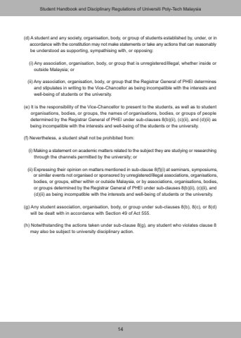 14(d) A student and any society, organisation, body, or group of students established by, under, or in accordance with the constitution may not make statements or take any actions that can reasonably be understood as supporting, sympathising with, or opposing: (i) Any association, organisation, body, or group that is unregistered/illegal, whether inside or outside Malaysia; or (ii) Any association, organisation, body, or group that the Registrar General of PHEI determines and stipulates in writing to the Vice-Chancellor as being incompatible with the interests and well-being of students or the university.(e) It is the responsibility of the Vice-Chancellor to present to the students, as well as to student organisations, bodies, or groups, the names of organisations, bodies, or groups of people determined by the Registrar General of PHEI under sub-clauses 8(b)(ii), (c)(ii), and (d)(ii) as being incompatible with the interests and well-being of the students or the university.(f) Nevertheless, a student shall not be prohibited from: (i) Making a statement on academic matters related to the subject they are studying or researching through the channels permitted by the university; or (ii) Expressing their opinion on matters mentioned in sub-clause 8(f)(i) at seminars, symposiums, or similar events not organised or sponsored by unregistered/illegal associations, organisations, bodies, or groups, either within or outside Malaysia, or by associations, organisations, bodies, or groups determined by the Registrar General of PHEI under sub-clauses 8(b)(ii), (c)(ii), and (d)(ii) as being incompatible with the interests and well-being of students or the university.(g) Any student association, organisation, body, or group under sub-clauses 8(b), 8(c), or 8(d) will be dealt with in accordance with Section 49 of Act 555.(h) Notwithstanding the actions taken under sub-clause 8(g), any student who violates clause 8 may also be subject to university disciplinary action.Student Handbook and Disciplinary Regulations of Universiti Poly-Tech Malaysia