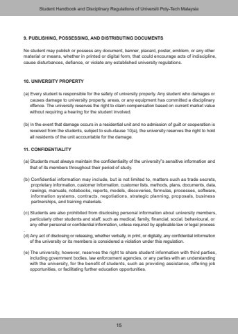 159. PUBLISHING, POSSESSING, AND DISTRIBUTING DOCUMENTSNo student may publish or possess any document, banner, placard, poster, emblem, or any other material or means, whether in printed or digital form, that could encourage acts of indiscipline, cause disturbances, defiance, or violate any established university regulations.10. UNIVERSITY PROPERTY(a) Every student is responsible for the safety of university property. Any student who damages or causes damage to university property, areas, or any equipment has committed a disciplinary offence. The university reserves the right to claim compensation based on current market value without requiring a hearing for the student involved.(b) In the event that damage occurs in a residential unit and no admission of guilt or cooperation is received from the students, subject to sub-clause 10(a), the university reserves the right to hold all residents of the unit accountable for the damage.11. CONFIDENTIALITY(a) Students must always maintain the confidentiality of the university%u201fs sensitive information and that of its members throughout their period of study.(b) Confidential information may include, but is not limited to, matters such as trade secrets, proprietary information, customer information, customer lists, methods, plans, documents, data, rawings, manuals, notebooks, reports, models, discoveries, formulas, processes, software, information systems, contracts, negotiations, strategic planning, proposals, business partnerships, and training materials.(c) Students are also prohibited from disclosing personal information about university members, particularly other students and staff, such as medical, family, financial, social, behavioural, or any other personal or confidential information, unless required by applicable law or legal process.(d) Any act of disclosing or releasing, whether verbally, in print, or digitally, any confidential information of the university or its members is considered a violation under this regulation.(e) The university, however, reserves the right to share student information with third parties, including government bodies, law enforcement agencies, or any parties with an understanding with the university, for the benefit of students, such as providing assistance, offering job opportunities, or facilitating further education opportunities.Student Handbook and Disciplinary Regulations of Universiti Poly-Tech Malaysia