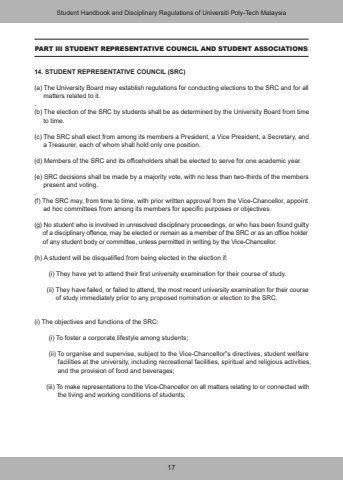 1714. STUDENT REPRESENTATIVE COUNCIL (SRC)(a) The University Board may establish regulations for conducting elections to the SRC and for all matters related to it..(b) The election of the SRC by students shall be as determined by the University Board from time to time.(c) The SRC shall elect from among its members a President, a Vice President, a Secretary, and a Treasurer, each of whom shall hold only one position.(d) Members of the SRC and its officeholders shall be elected to serve for one academic year.(e) SRC decisions shall be made by a majority vote, with no less than two-thirds of the members present and voting..(f) The SRC may, from time to time, with prior written approval from the Vice-Chancellor, appoint ad hoc committees from among its members for specific purposes or objectives.(g) No student who is involved in unresolved disciplinary proceedings, or who has been found guilty of a disciplinary offence, may be elected or remain as a member of the SRC or as an office holder of any student body or committee, unless permitted in writing by the Vice-Chancellor.(h) A student will be disqualified from being elected in the election if: (i) They have yet to attend their first university examination for their course of study. (ii) They have failed, or failed to attend, the most recent university examination for their course of study immediately prior to any proposed nomination or election to the SRC.(i) The objectives and functions of the SRC: (i) To foster a corporate lifestyle among students; (ii) To organise and supervise, subject to the Vice-Chancellor%u201fs directives, student welfare facilities at the university, including recreational facilities, spiritual and religious activities, and the provision of food and beverages; (iii) To make representations to the Vice-Chancellor on all matters relating to or connected with the living and working conditions of students;Student Handbook and Disciplinary Regulations of Universiti Poly-Tech MalaysiaPART III STUDENT REPRESENTATIVE COUNCIL AND STUDENT ASSOCIATIONS%ufffd