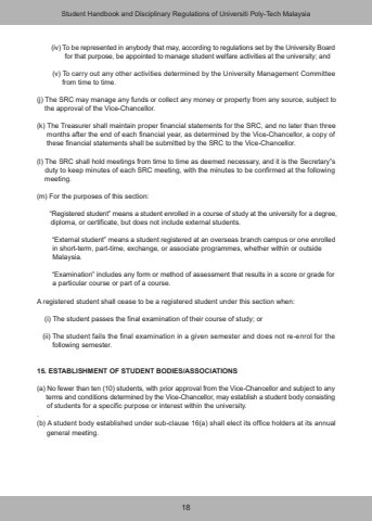 18 (iv) To be represented in anybody that may, according to regulations set by the University Board for that purpose, be appointed to manage student welfare activities at the university; and (v) To carry out any other activities determined by the University Management Committee from time to time.(j) The SRC may manage any funds or collect any money or property from any source, subject to the approval of the Vice-Chancellor.(k) The Treasurer shall maintain proper financial statements for the SRC, and no later than three months after the end of each financial year, as determined by the Vice-Chancellor, a copy of these financial statements shall be submitted by the SRC to the Vice-Chancellor.(l) The SRC shall hold meetings from time to time as deemed necessary, and it is the Secretary%u201fs duty to keep minutes of each SRC meeting, with the minutes to be confirmed at the following meeting.(m) For the purposes of this section: %u201cRegistered student%u201d means a student enrolled in a course of study at the university for a degree, diploma, or certificate, but does not include external students. %u201cExternal student%u201d means a student registered at an overseas branch campus or one enrolled in short-term, part-time, exchange, or associate programmes, whether within or outside Malaysia. %u201cExamination%u201d includes any form or method of assessment that results in a score or grade for a particular course or part of a course.A registered student shall cease to be a registered student under this section when: (i) The student passes the final examination of their course of study; or (ii) The student fails the final examination in a given semester and does not re-enrol for the following semester.15. ESTABLISHMENT OF STUDENT BODIES/ASSOCIATIONS(a) No fewer than ten (10) students, with prior approval from the Vice-Chancellor and subject to any terms and conditions determined by the Vice-Chancellor, may establish a student body consisting of students for a specific purpose or interest within the university.(b) A student body established under sub-clause 16(a) shall elect its office holders at its annual general meeting.Student Handbook and Disciplinary Regulations of Universiti Poly-Tech Malaysia