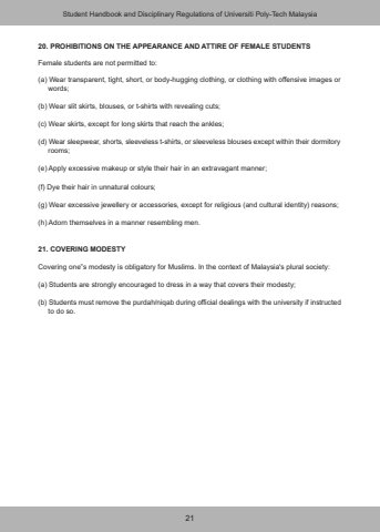 2120. PROHIBITIONS ON THE APPEARANCE AND ATTIRE OF FEMALE STUDENTSFemale students are not permitted to:(a) Wear transparent, tight, short, or body-hugging clothing, or clothing with offensive images or words;(b) Wear slit skirts, blouses, or t-shirts with revealing cuts;(c) Wear skirts, except for long skirts that reach the ankles;(d) Wear sleepwear, shorts, sleeveless t-shirts, or sleeveless blouses except within their dormitory rooms;(e) Apply excessive makeup or style their hair in an extravagant manner;(f) Dye their hair in unnatural colours;(g) Wear excessive jewellery or accessories, except for religious (and cultural identity) reasons;(h) Adorn themselves in a manner resembling men.21. COVERING MODESTYCovering one%u201fs modesty is obligatory for Muslims. In the context of Malaysia's plural society:(a) Students are strongly encouraged to dress in a way that covers their modesty;(b) Students must remove the purdah/niqab during official dealings with the university if instructed to do so.Student Handbook and Disciplinary Regulations of Universiti Poly-Tech Malaysia