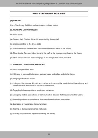 22(A) LIBRARYUse of the library, facilities, and services as outlined belo22. GENERAL LIBRARY RULESStudents must:(a) Present their Student ID card if requested by library staff;(b) Dress according to the dress code(c) Maintain silence and ensure a peaceful environment while in the library;(d) Show books, files, and other items to the staff at the counter when leaving the library;(e) Store personal books and belongings in the designated areas provided.23. GENERAL LIBRARY PROHIBITIONSStudents are prohibited from:((a) Bringing in personal belongings such as bags, umbrellas, and similar items;(b) Bringing in food and drinks;(c) Using mobile phones. All calls and call receptions must be made in the library lobby, and communication devices must be set to silent mode;(d) Engaging in inappropriate or suspicious behaviour;(e) Using any mobile applications or communication devices that may disturb other users;(f) Removing reference materials or library equipment without permission;(g) Damaging or rearranging library furniture;(h) Tearing or damaging reference materials;(i) Violating any additional regulations set by the library.Student Handbook and Disciplinary Regulations of Universiti Poly-Tech Malaysia