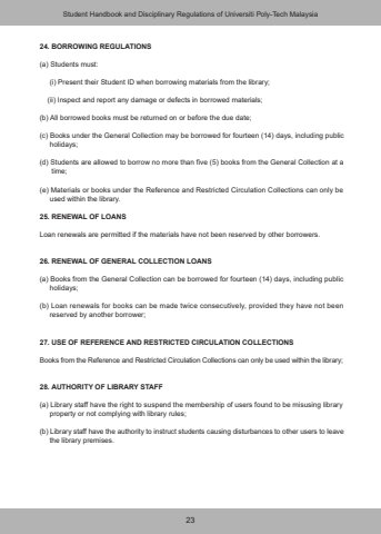 2324. BORROWING REGULATIONS(a) Students must: (i) Present their Student ID when borrowing materials from the library; (ii) Inspect and report any damage or defects in borrowed materials;(b) All borrowed books must be returned on or before the due date;(c) Books under the General Collection may be borrowed for fourteen (14) days, including public holidays;(d) Students are allowed to borrow no more than five (5) books from the General Collection at a time;(e) Materials or books under the Reference and Restricted Circulation Collections can only be used within the library.25. RENEWAL OF LOANSLoan renewals are permitted if the materials have not been reserved by other borrowers.26. RENEWAL OF GENERAL COLLECTION LOANS(a) Books from the General Collection can be borrowed for fourteen (14) days, including public holidays;(b) Loan renewals for books can be made twice consecutively, provided they have not been reserved by another borrower;27. USE OF REFERENCE AND RESTRICTED CIRCULATION COLLECTIONSBooks from the Reference and Restricted Circulation Collections can only be used within the library;28. AUTHORITY OF LIBRARY STAFF(a) Library staff have the right to suspend the membership of users found to be misusing library property or not complying with library rules;(b) Library staff have the authority to instruct students causing disturbances to other users to leave the library premises.Student Handbook and Disciplinary Regulations of Universiti Poly-Tech Malaysia