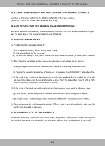 2429. STUDENT RESPONSIBILITY FOR THE CONDITION OF BORROWED MATERIALSBorrowers are responsible for the library materials in their possession.(Refer to Clause 31: LOSS OF LIBRARY BOOKS)30. LATE RETURN FINES FOR GENERAL COLLECTION MATERIALSStudents who return General Collection books after the due date will be fined RM1.00 per day for each book. The maximum late fine is RM50.00.31. LOSS OF LIBRARY BOOKS(a) A material will be considered lost if: (i) It is reported missing after a library stock check; (ii) It is reported lost by the borrower; (iii) It is reported lost by a user, and a search has been conducted three (3) times within a month.(b) The following penalties will be imposed on borrowers who lose library books: (i) Replacing the book with the same or latest edition + processing fee of RM25.00; (ii) Paying the current market price of the book + processing fee of RM25.00 + late return fine.(c) If the book does not have a listed price or is no longer available in the market, its price will be determined based on the original purchase price from the acquisition record, with a 10% annual increase, subject to a maximum of 100%;(d) If the price of the book cannot be determined, the borrower must pay the following rates: (i) Local books %u2013 Estimated price to a maximum of RM200 + processing fee of RM25; (ii) Foreign books %u2013 Estimated price to a maximum of RM500 + processing fee of RM25;(e) Payments made for lost/damaged materials (if found later) cannot be refunded after one (1) month from the date of payment.32. NON-GENERAL COLLECTION MATERIALSReference materials, restricted circulation items, magazines, newspapers, media equipment, and similar items are not allowed to be taken out without the permission of library staff.Student Handbook and Disciplinary Regulations of Universiti Poly-Tech Malaysia