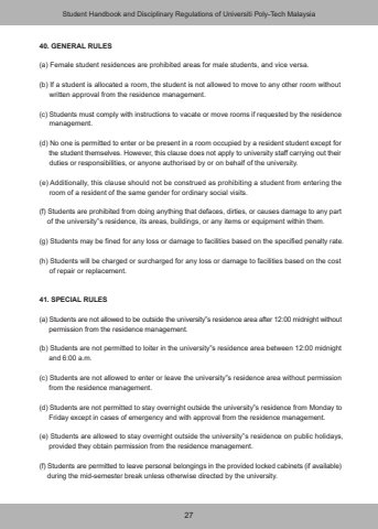 2740. GENERAL RULES(a) Female student residences are prohibited areas for male students, and vice versa.(b) If a student is allocated a room, the student is not allowed to move to any other room without written approval from the residence management.(c) Students must comply with instructions to vacate or move rooms if requested by the residence management.(d) No one is permitted to enter or be present in a room occupied by a resident student except for the student themselves. However, this clause does not apply to university staff carrying out their duties or responsibilities, or anyone authorised by or on behalf of the university.(e) Additionally, this clause should not be construed as prohibiting a student from entering the room of a resident of the same gender for ordinary social visits.(f) Students are prohibited from doing anything that defaces, dirties, or causes damage to any part of the university%u201fs residence, its areas, buildings, or any items or equipment within them.(g) Students may be fined for any loss or damage to facilities based on the specified penalty rate.(h) Students will be charged or surcharged for any loss or damage to facilities based on the cost of repair or replacement.41. SPECIAL RULES(a) Students are not allowed to be outside the university%u201fs residence area after 12:00 midnight without permission from the residence management.(b) Students are not permitted to loiter in the university%u201fs residence area between 12:00 midnight and 6:00 a.m.(c) Students are not allowed to enter or leave the university%u201fs residence area without permission from the residence management.(d) Students are not permitted to stay overnight outside the university%u201fs residence from Monday to Friday except in cases of emergency and with approval from the residence management.(e) Students are allowed to stay overnight outside the university%u201fs residence on public holidays, provided they obtain permission from the residence management.(f) Students are permitted to leave personal belongings in the provided locked cabinets (if available) during the mid-semester break unless otherwise directed by the university.Student Handbook and Disciplinary Regulations of Universiti Poly-Tech Malaysia
