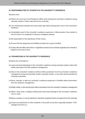 2842. RESPONSIBILITIES OF STUDENTS IN THE UNIVERSITY%u2019S RESIDENCEStudents must:(a) Return the room key to the Residence Office when leaving the university%u201fs residence during semester breaks or when instructed by the university;(b) Turn off electrical switches and close water taps before leaving their room in the university%u201fs residence;(c) Immediately report to the university%u201fs residence supervisor or fellow warden if any student is found to have or is suspected of having a contagious disease;(d) Be responsible for the cleanliness of their rooms;(e) Ensure that the equipment and facilities provided are in good condition;(f) Comply with all written instructions or regulations issued by the university regarding the university%u201fs residence from time to time..43. PROHIBITIONS IN THE UNIVERSITY%u2019S RESIDENCEStudents are not allowed to:(a) Leave personal belongings in the university%u201fs residence during semester breaks unless with written permission from the residence management;(b) Stay in the university%u201fs residence without written permission from the university%u201fs residence management during mid-semester breaks, semester breaks, or any other period specified by university authorities;(c) Move, relocate, or alter any university%u201fs residence equipment or facilities without permission from the residence management;(d) Modify, install, or add security locks without permission from the university%u201fs residence management;(e) Attach, hang, draw, or display anything that could cause damage to the university%u201fs residence room or area;(f) Bring in, possess, or use any electrical or electronic equipment that is not approved by the university;(g) Cause any disturbance to other residents or the public at any time, especially between 12:00 midnight and 6:00 a.m.;Student Handbook and Disciplinary Regulations of Universiti Poly-Tech Malaysia