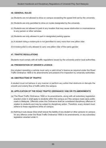 3046. GENERAL RULES(a) Students are not allowed to drive on campus exceeding the speed limit set by the university.(b) Students are only permitted to drive on routes designated by the university.(c) Students are not allowed to park in any location that may cause obstruction or inconvenience to any person or other vehicles.(d) Students are only allowed to park in designated parking spaces.(e) A student riding a motorcycle is not permitted to carry more than one pillion rider.(f) A motorcyclist is only allowed to carry one pillion rider of the same gender.47. TRAFFIC REGULATIONSStudents must comply with all traffic regulations issued by the university and/or local authorities.48. PRESENTATION OF DRIVER%u2019S LICENCEAny student operating a vehicle must carry a valid driver%u201fs licence as required under the Road Traffic Ordinance 1958 or its amendments and present it for inspection by university authorities.49. OBSTRUCTION OF TRAFFICA student must not behave in any manner or perform any action that obstructs or disrupts the smooth and orderly flow of traffic within the campus.50. APPLICATION OF THE ROAD TRAFFIC ORDINANCE 1958 OR ITS AMENDMENTS(a) The Road Traffic Ordinance 1958 or its amendments, along with all subsidiary legislation enacted under it, shall apply to students within the campus as if the campus roads were public roads in Malaysia. Offences under this Ordinance shall be considered disciplinary offences in relation to students and may be subject to disciplinary action. Therefore, every student must adhere to these regulations while on campus.(b) Nothing in sub-clause 50(a) shall reduce the liability of any student or other persons on campus for any offence under the Road Traffic Ordinance 1958 or its amendments, or any subsidiary legislation enacted under it.Student Handbook and Disciplinary Regulations of Universiti Poly-Tech Malaysia
