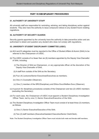 3151. AUTHORITY OF UNIVERSITY STAFFAll university staff are responsible for reminding, advising, and taking disciplinary action against students. They also have the authority to issue compound notices to any student found violating regulations.52. AUTHORITY OF SECURITY GUARDSSecurity guards appointed by the university have the authority to take preventive action and are authorised to detain and question any student who does not comply with regulations.53. UNIVERSITY STUDENT DISCIPLINARY COMMITTEE (USDC)(a) All A and B categories must be reported to the Office of Student Affairs & Alumni (SAA) to be referred to the Chairperson of USDC.(b) The USDC consists of no fewer than six (6) members appointed by the Deputy Vice-Chancellor of SAA, including: (i) The Director of SAA as Chairperson, or any appropriate officer at the discretion of the Deputy Vice-Chancellor of SAA; (ii) A staff from outside of the SAA as the Secretary; (iii) Four (4) Lecturers/Senior Executives/Executives as members; (iv) One (1) Counsellor (Observer); (v) One (1) member of the SRC/Disciplinary and Ethics Exco/Welfare Exco (Observer).(c) A quorum for disciplinary procedures consists of the Chairperson and two (2) USDC members (excluding the Secretary).(d) For each case, the Chairperson of USDC must appoint a Student Disciplinary Investigation Officer Team, led by one (1) Senior Executive/Executive of the SAA.(e) The Student Disciplinary Investigation Officer Team must consist of at least three (3) members, as follows: (i) One (1) Senior Executive/Executive of the SAA; (ii) Two (2) staff members (Executive/Assistant Executive/Senior Clerk/Clerk).Note: The Student Disciplinary Investigation Officer Team must include both male and female staff members.Student Handbook and Disciplinary Regulations of Universiti Poly-Tech Malaysia