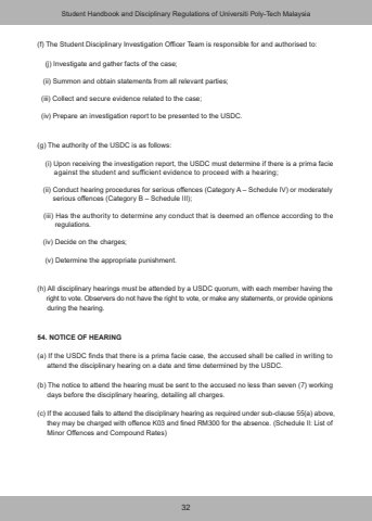32(f) The Student Disciplinary Investigation Officer Team is responsible for and authorised to: (j) Investigate and gather facts of the case; (ii) Summon and obtain statements from all relevant parties; (iii) Collect and secure evidence related to the case; (iv) Prepare an investigation report to be presented to the USDC.(g) The authority of the USDC is as follows: (i) Upon receiving the investigation report, the USDC must determine if there is a prima facie against the student and sufficient evidence to proceed with a hearing; (ii) Conduct hearing procedures for serious offences (Category A %u2013 Schedule IV) or moderately serious offences (Category B %u2013 Schedule III); (iii) Has the authority to determine any conduct that is deemed an offence according to the regulations. (iv) Decide on the charges; (v) Determine the appropriate punishment.(h) All disciplinary hearings must be attended by a USDC quorum, with each member having the right to vote. Observers do not have the right to vote, or make any statements, or provide opinions during the hearing.54. NOTICE OF HEARING(a) If the USDC finds that there is a prima facie case, the accused shall be called in writing to attend the disciplinary hearing on a date and time determined by the USDC.(b) The notice to attend the hearing must be sent to the accused no less than seven (7) working days before the disciplinary hearing, detailing all charges.(c) If the accused fails to attend the disciplinary hearing as required under sub-clause 55(a) above, they may be charged with offence K03 and fined RM300 for the absence. (Schedule II: List of Minor Offences and Compound Rates)Student Handbook and Disciplinary Regulations of Universiti Poly-Tech Malaysia