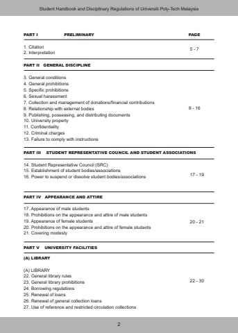 2PART IV APPEARANCE AND ATTIRE17. Appearance of male students18. Prohibitions on the appearance and attire of male students19. Appearance of female students20. Prohibitions on the appearance and attire of female students21. Covering modestyPART III STUDENT REPRESENTATIVE COUNCIL AND STUDENT ASSOCIATIONS14. Student Representative Council (SRC)15. Establishment of student bodies/associations16. Power to suspend or dissolve student bodies/associationsPART II GENERAL DISCIPLINE3. General conditions4. General prohibitions5. Specific prohibitions6. Sexual harassment7. Collection and management of donations/financial contributions8. Relationship with external bodies9. Publishing, possessing, and distributing documents10. University property11. Confidentiality12. Criminal charges13. Failure to comply with instructionsPART I PRELIMINARY PAGE1. Citation2. Interpretation 5 - 78 - 16 17 - 19 20 - 21 22 - 30PART V UNIVERSITY FACILITIES(A) LIBRARY(A) LIBRARY22. General library rules23. General library prohibitions24. Borrowing regulations25. Renewal of loans26. Renewal of general collection loans27. Use of reference and restricted circulation collectionsStudent Handbook and Disciplinary Regulations of Universiti Poly-Tech Malaysia