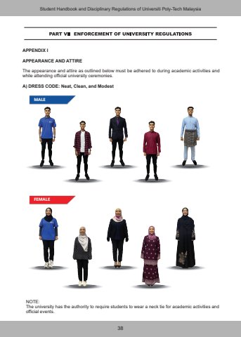 38APPENDIX IAPPEARANCE AND ATTIREThe appearance and attire as outlined below must be adhered to during academic activities and while attending official university ceremonies.A) DRESS CODE: Neat, Clean, and ModestNOTE:The university has the authority to require students to wear a neck tie for academic activities and official events.MALEStudent Handbook and Disciplinary Regulations of Universiti Poly-Tech MalaysiaFEMALE