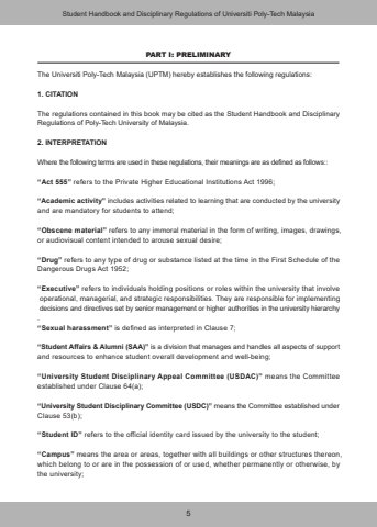 5PART I: PRELIMINARYThe Universiti Poly-Tech Malaysia (UPTM) hereby establishes the following regulations:1. CITATIONThe regulations contained in this book may be cited as the Student Handbook and DisciplinaryRegulations of Poly-Tech University of Malaysia.2. INTERPRETATIONWhere the following terms are used in these regulations, their meanings are as defined as follows::%u201cAct 555%u201d refers to the Private Higher Educational Institutions Act 1996;%u201cAcademic activity%u201d includes activities related to learning that are conducted by the university and are mandatory for students to attend;%u201cObscene material%u201d refers to any immoral material in the form of writing, images, drawings, or audiovisual content intended to arouse sexual desire;%u201cDrug%u201d refers to any type of drug or substance listed at the time in the First Schedule of the Dangerous Drugs Act 1952;%u201cExecutive%u201d refers to individuals holding positions or roles within the university that involve operational, managerial, and strategic responsibilities. They are responsible for implementing decisions and directives set by senior management or higher authorities in the university hierarchy.%u201cSexual harassment%u201d is defined as interpreted in Clause 7;%u201cStudent Affairs & Alumni (SAA)%u201d is a division that manages and handles all aspects of support and resources to enhance student overall development and well-being;%u201cUniversity Student Disciplinary Appeal Committee (USDAC)%u201d means the Committee established under Clause 64(a);%u201cUniversity Student Disciplinary Committee (USDC)%u201d means the Committee established under Clause 53(b);%u201cStudent ID%u201d refers to the official identity card issued by the university to the student;%u201cCampus%u201d means the area or areas, together with all buildings or other structures thereon, which belong to or are in the possession of or used, whether permanently or otherwise, by the university;Student Handbook and Disciplinary Regulations of Universiti Poly-Tech Malaysia