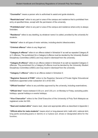 6%u201cCounsellor%u201d means a person who is authorised to assist and guide students;%u201cRestricted area%u201d refers to any part or area of the campus and residence that is prohibited from entry at specified times, except with the permission of the university.%u201cProhibited area%u201d refers to any part or area of the campus and residence where entry is always forbidden;%u201cResidence%u201d refers to any dwelling, by whatever name it is called, provided by the university for students.%u201cVehicle%u201d refers to all types of motor vehicles, including electric bikes/scooters;%u201cCriminal offence%u201f refers to any illegal act;%u201dCategory A offence%u201d refers to an offence stated in Schedule IV as well as repeated Category B or C offences. The punishment for a Category A offence must be decided by the University Student Disciplinary Committee (USDC) and may result in dismissal from the university;%u201cCategory B offence%u201d refers to an offence stated in Schedule III as well as repeated Category C offences. The punishment for a Category B offence must be decided by the University StudentDisciplinary Committee (USDC) and may result in dismissal from the university;%u201cCategory C offence%u201d refers to an offence stated in Schedule II;%u201cRegistrar General of PHEI%u201d refers to the Registrar General of Private Higher Educational Institutions appointed under subsection 3(1) of Act 555.%u201cOfficial function%u201d refers to any activities approved by the university, including examinations;%u201cOfficial time%u201d means between 8.30 a.m. and 5.30 p.m. on Monday to Friday, excluding public holidays, special holidays or events holidays;%u201cVice-Chancellor%u201d refers to the Chief Executive of the University of Poly-Tech Malaysia as registered under Act 555.%u201cNeat and modest attire%u201d means neat, clean and appropriate attire as described in Appendix I;%u201cOfficial attire for male students%u201f means short or long-sleeved shirt, batik shirt, national shirt, long pants (excluding jeans or denim) or a 3-piece suit, shoes or designated attire for the function;Student Handbook and Disciplinary Regulations of Universiti Poly-Tech Malaysia